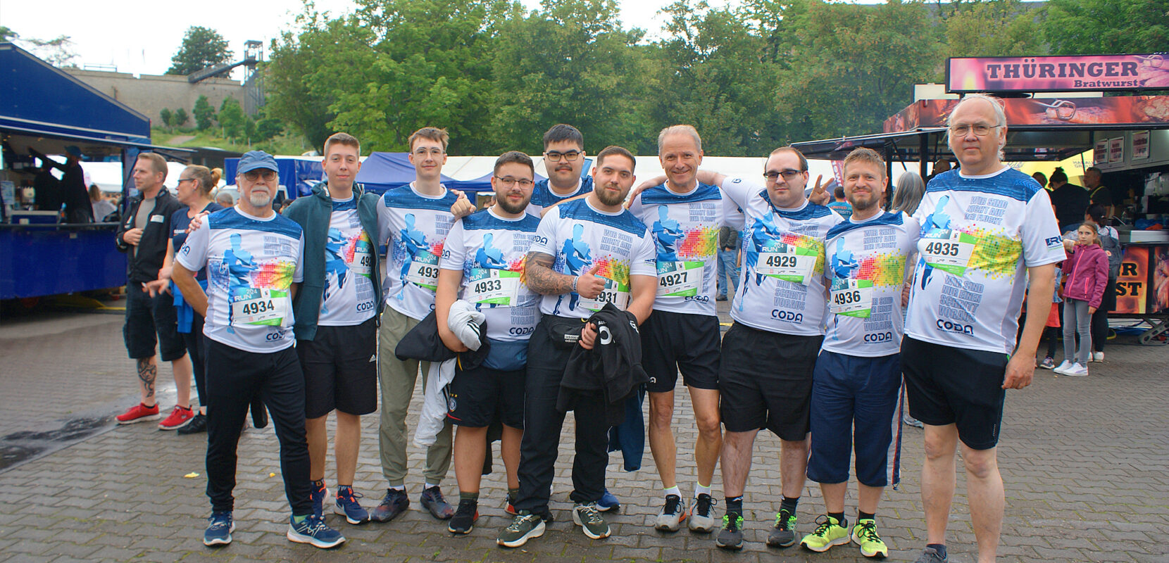Die CODA Computer und Programme GmbH durfte bei solch einen Event natürlich nicht fehlen. Mit neu gestalteten Trikots ging die bisher größte Laufgruppe der Firmengeschichte an den Start. Der Wettergott schien kein „Runner“ zu sein, bei durchwachsenen Wetter gab es immer wieder ungewollte Duschen vom Himmel. Das konnte uns aber nicht abschrecken. Auch wenn sich der Eine oder Andere auf der letzten Rille ins Ziel schleppte, galt es: